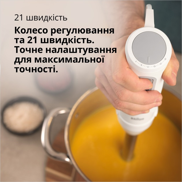 MultiQuick 5 надає вам 21 регульовану швидкість + режим турбо, колесо керування та двигун потужністю 1000 Вт для швидкого та ефективного змішування.