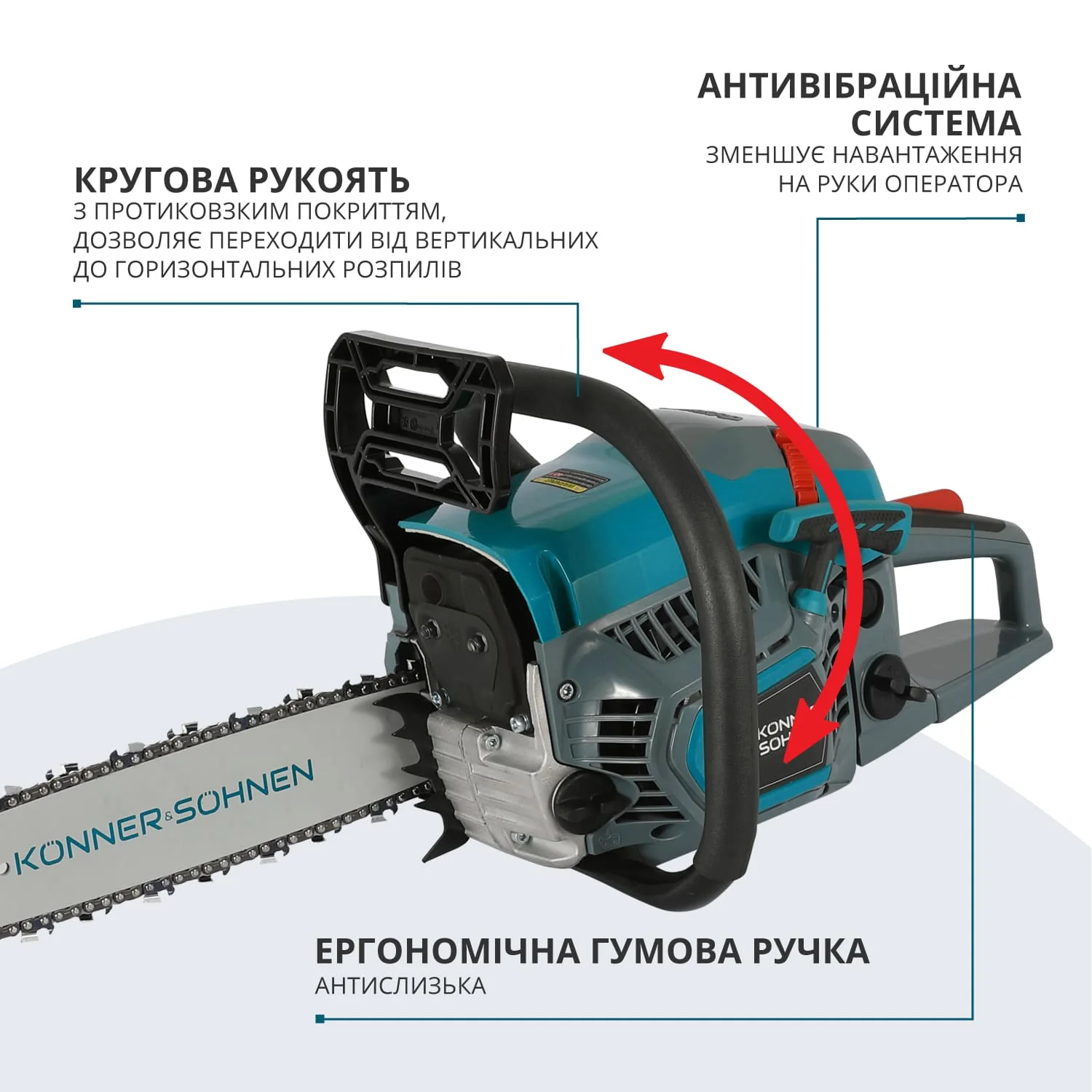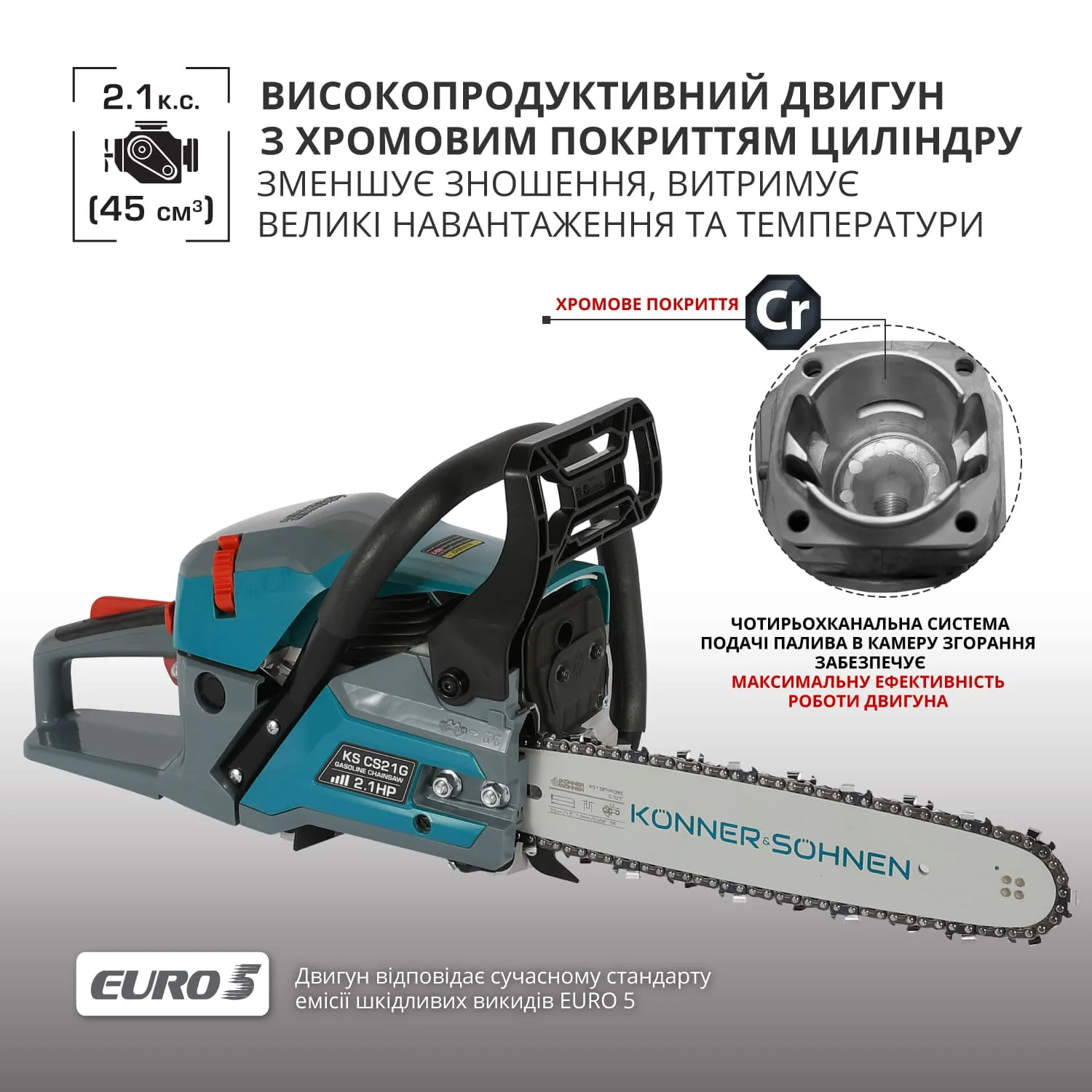 Бензинова ланцюгова пила Könner & Söhnen KS CS21G-13 поєднує в собі німецьку надійность та повну автономність для роботи в будь-яких умовах. Завдяки двигуну з технологією High Engine Efficiency, інструмент забезпечує стабільні оберти під навантаженням, дозволяючи легко розпилювати щільну деревину при мінімальних витратах палива та зусиллях з боку користувача.