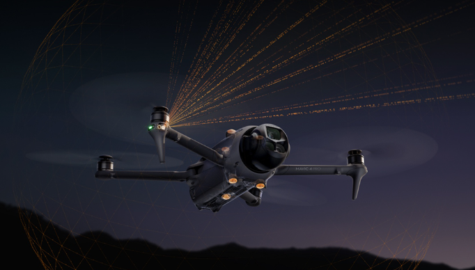 Mavic 4 Pro оснащений шістьма високопродуктивними датчиками типу «риб’яче око» для роботи в умовах низької освітленості та двома процесорами для високої роздільної здатності відстеження навколишнього середовища. Він забезпечує всеспрямоване уникнення перешкод зі швидкістю до 18 м/с навіть в умовах низької освітленості до 0,1 люкс, наприклад, в умовах освітлення лише вуличними ліхтарями. Незалежно від того, чи подорожуєте ви каньйонами чи міськими ландшафтами зі слабким супутниковим сигналом, ця високопродуктивна візуальна система забезпечує точне позиціонування дрона. У майже непроглядній темряві з яскравістю нижче 0,1 люкс він все ще може використовувати свій передній LiDAR для виявлення перешкод попереду та швидкого гальмування, щоб уникнути зіткнень.