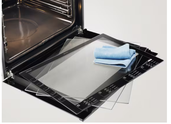 Скло дверцят цієї духової шафи дуже просто очищувати. Можна повністю зняти дверцята та скляні панелі і швидко їх очистити.