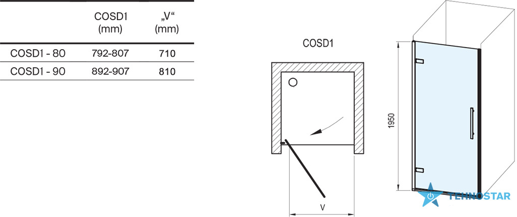 Повернувши виріб на 180°, ви отримуєте можливість відкриття дверей ліворуч або праворуч. Виріб монтується в цегляну нішу, або у поєднанні з нерухомою стінкою COPS, на литі піддони RAVAK Perseus Pro, Perseus Pro Flat, Perseus Pro Chrome, Gigant, Gigant Pro, Gigant Pro Flat, Gigant Pro Chrome або безпосередньо на підлогу з вбудованим зливом або зливом у підлозі. Тримач входить у комплект. За допомогою регулювального профілю CONPS душові двері можна розширити на 25 мм (з боку, де розташований магніт, і їх можна використовувати лише при встановленні в ніші).