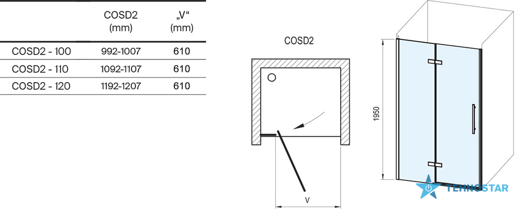 Повернувши виріб на 180 °, ви отримуєте можливість відкриття дверей ліворуч або праворуч. Виріб монтується в цегляну нішу або у поєднанні з нерухомою стінкою COPS на литі піддони RAVAK Gigant, Gigant Pro, Gigant Pro Flat, Gigant Pro Chrome або безпосередньо на підлогу з вбудованим зливом або трапом у підлозі. Утримувач входить у комплект. За допомогою регулювального профілю CONPS душові двері можна розширити на 25 мм (з боку, де розташований магніт, і можна використовувати тільки при установці в ніші).