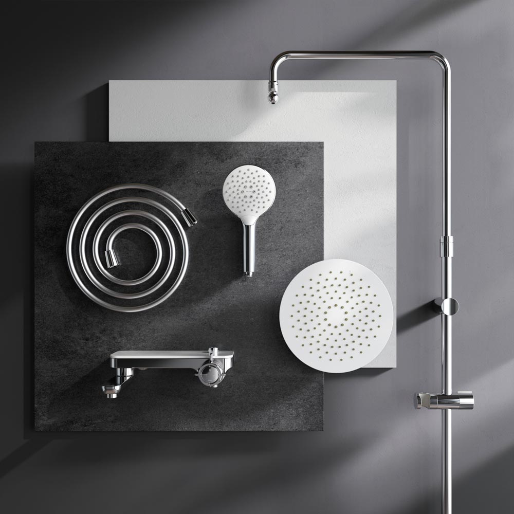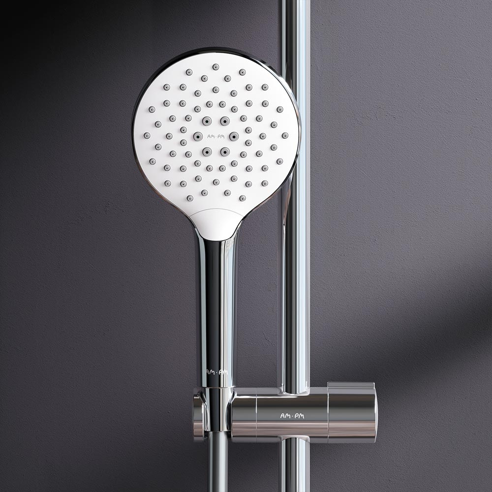 Тотальный дизайн в действии: все детали душевой системы – от пропорций ручного и верхнего душей до рисунка расположения форсунок на лейках.
