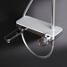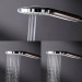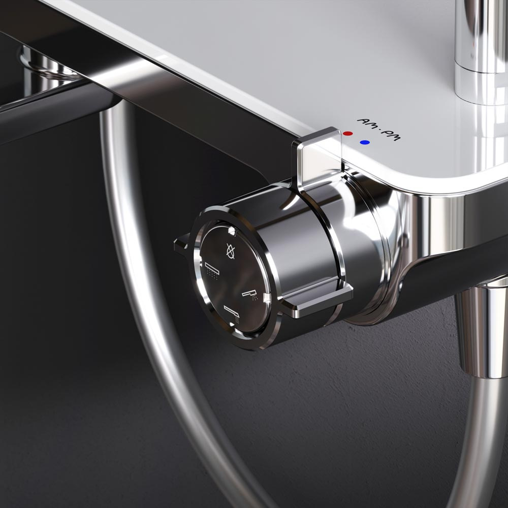 Смеситель выполнен в виде полочки. Чистый дизайн без лишних деталей: переключатель расположен за ручкой настройки температуры и позволяет менять источник потока воды от ручной лейки и излива до верхнего душа.