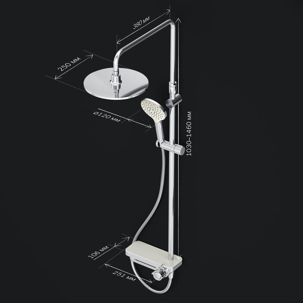 Премиальные размеры и продуманные детали: увеличенный диаметр душевых леек (верхний душ 254 мм и ручной душ 120 мм) позволит ощутить преимущества тропического душа, тогда как увеличенная длина шланга 1750 мм обеспечит свободу движений во время принятия душа. Телескопическая поворотная штанга регулируется по высоте в диапазоне от 1030 до 1460 мм, обеспечивая комфорт для людей любого роста, а шаровой шарнир в держателе верхнего душа позволяет регулировать угол его наклона.