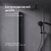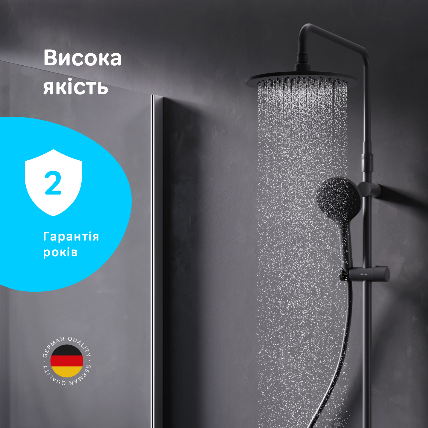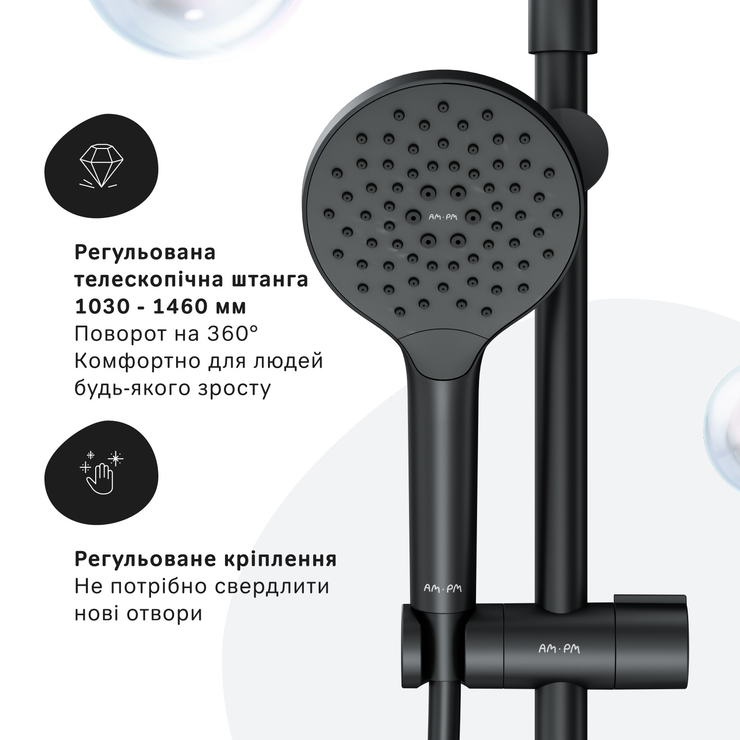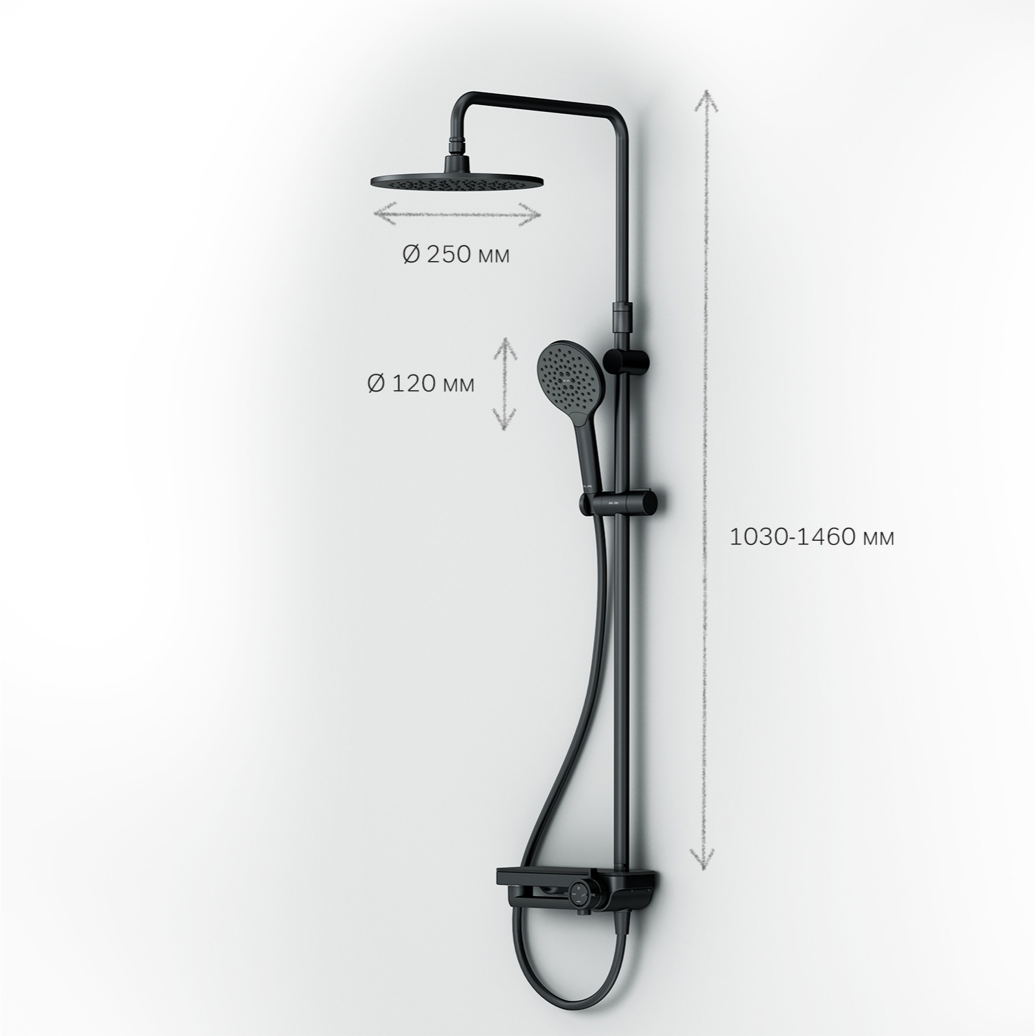Преміальні розміри і продумані деталі: збільшений діаметр душових лійок (верхній душ 220 мм і ручний душ 120 мм) дозволить відчути переваги тропічного душу, тоді як збільшена довжина шланга 1750 мм забезпечить свободу рухів під час прийняття душу. Телескопічна поворотна штанга регулюється по висоті в діапазоні від 1030 до 1460 мм, забезпечуючи комфорт для людей будь-якого зросту, а кульовий шарнір в тримачі верхнього душа дозволяє регулювати кут його нахилу.