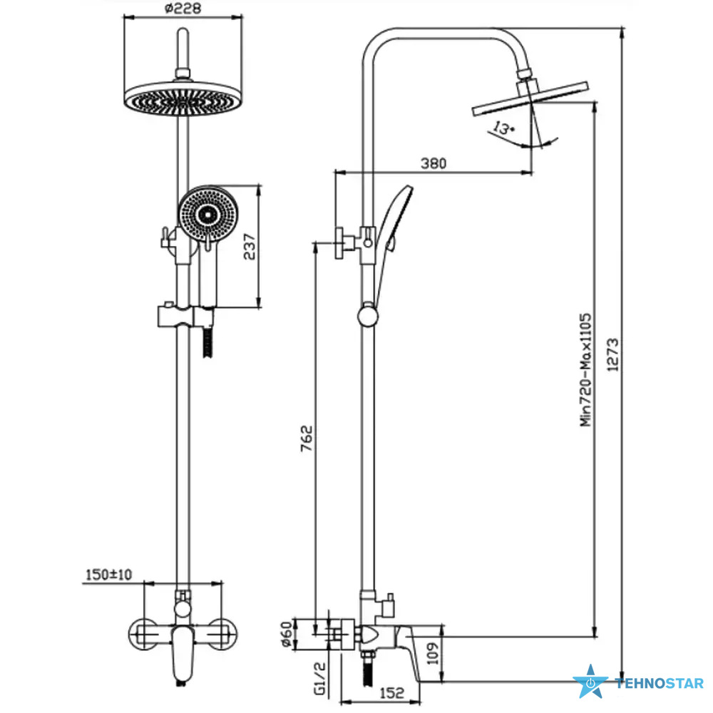 Система розроблена для забезпечення максимального комфорту: великий верхній душ створює об'ємний ефект тропічної зливи для повного розслаблення, а зручна ручна лійка додає мобільності для щоденних гігієнічних процедур. Керування потоком та температурою води здійснюється за допомогою ергономічного одноважельного змішувача, який забезпечує плавне та точне налаштування. Душова штанга дозволяє регулювати висоту розміщення верхнього душу, адаптуючи систему під зріст користувача, а спеціальні еластичні форсунки на лійках спрощують очищення від вапняного нальоту.