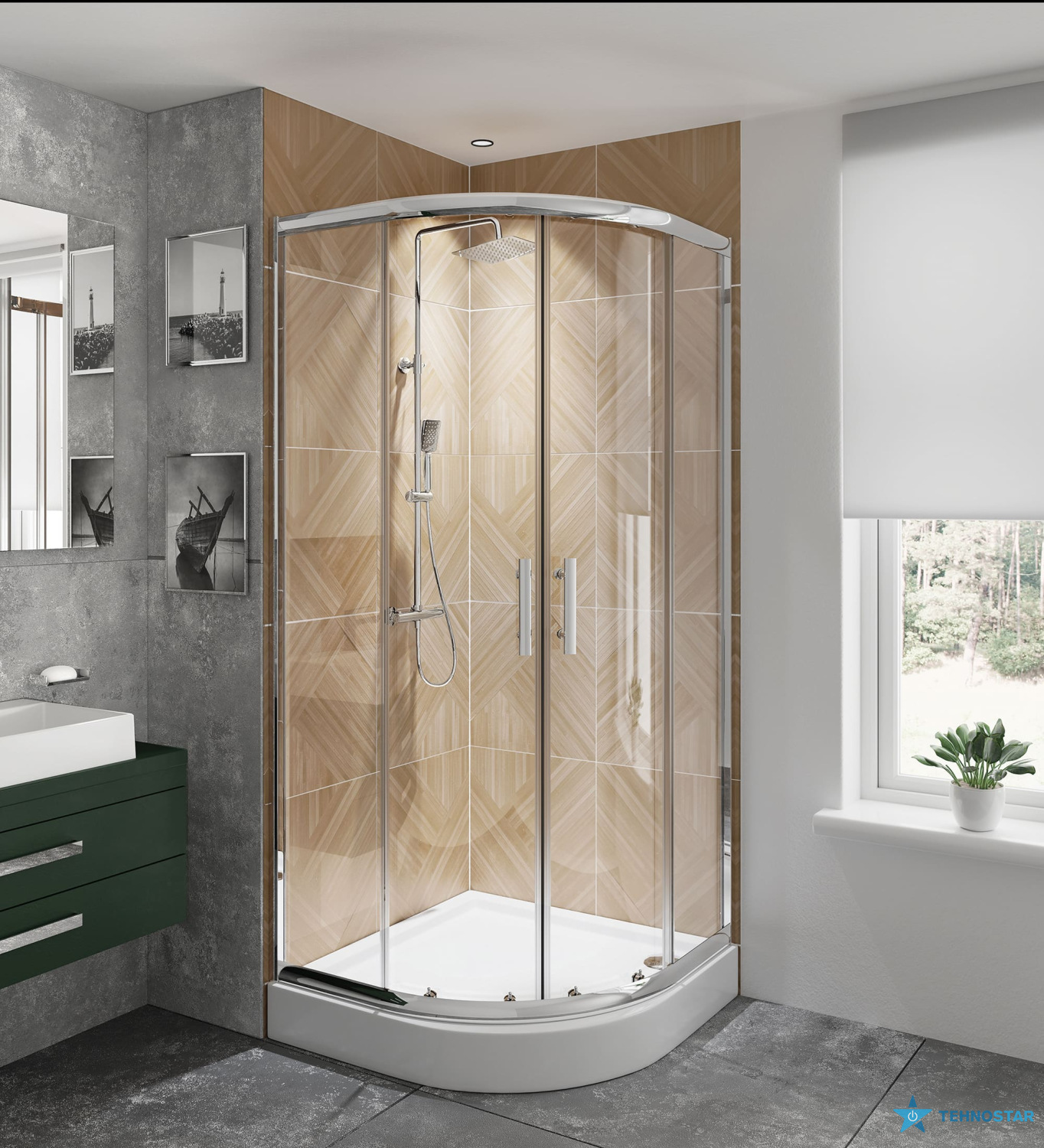 Це кутова напівкругла душова кабіна серії Jasmin Plus, призначена для встановлення між двома стінами у ванній кімнаті. Модель поєднує прозоре загартоване скло та хромовані профілі, забезпечуючи класичний вигляд, водночас практичність і надійність.
