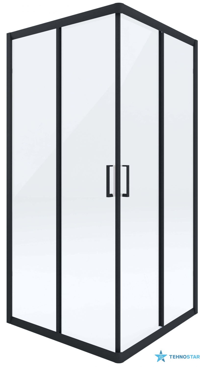Форма: квадратна, Матеріал вітражу: загартоване скло, Колір профілю: чорний, Тип відкриття дверей: розсувні, Наявність піддону: немає, Габарити, см: ширина: 90, глибина: 90, висота: 185