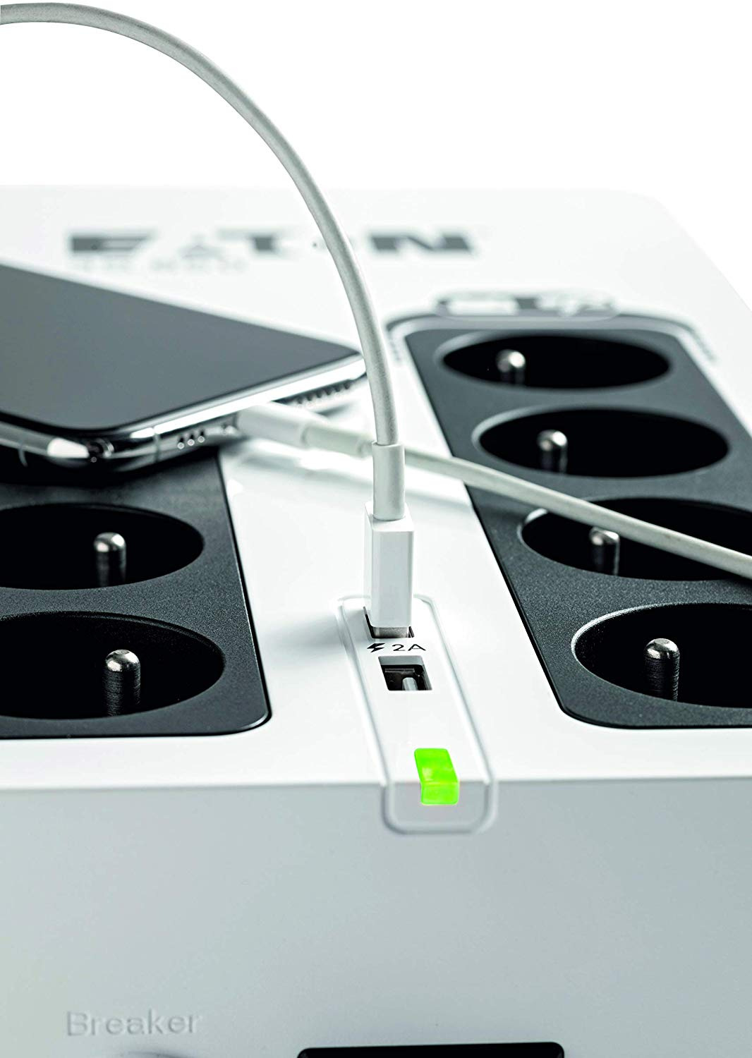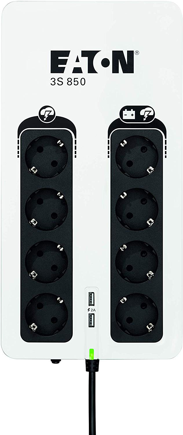 Джерело безперебійного живлення Eaton 3S850D забезпечує стабільну роботу важливої електроніки за відсутності напруги. Має потужність 850ВА (510Вт), 8 розеток Schuko (4 з батарейним живленням і 4 з фільтрацією), інтерфейс USB, 2 USB-порти для заряджання.