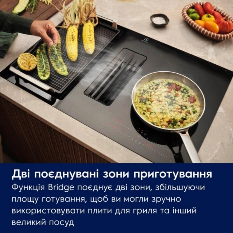 Electrolux ECC83443CZ — інноваційна індукційна поверхня 80 см з вбудованою витяжкою для кухонь без окремої витяжки. Потужність 1500 Вт, подвійні стінки з нержавіючої сталі — зовнішня холодна, внутрішня швидко нагріває. Bridge-функція об’єднує 2 зони в одну велику для сковорідок чи гусятниць. 6 температурних режимів + підтримка тепла. Сенсорне керування на поверхні, захист від дітей, автоматичне відключення.