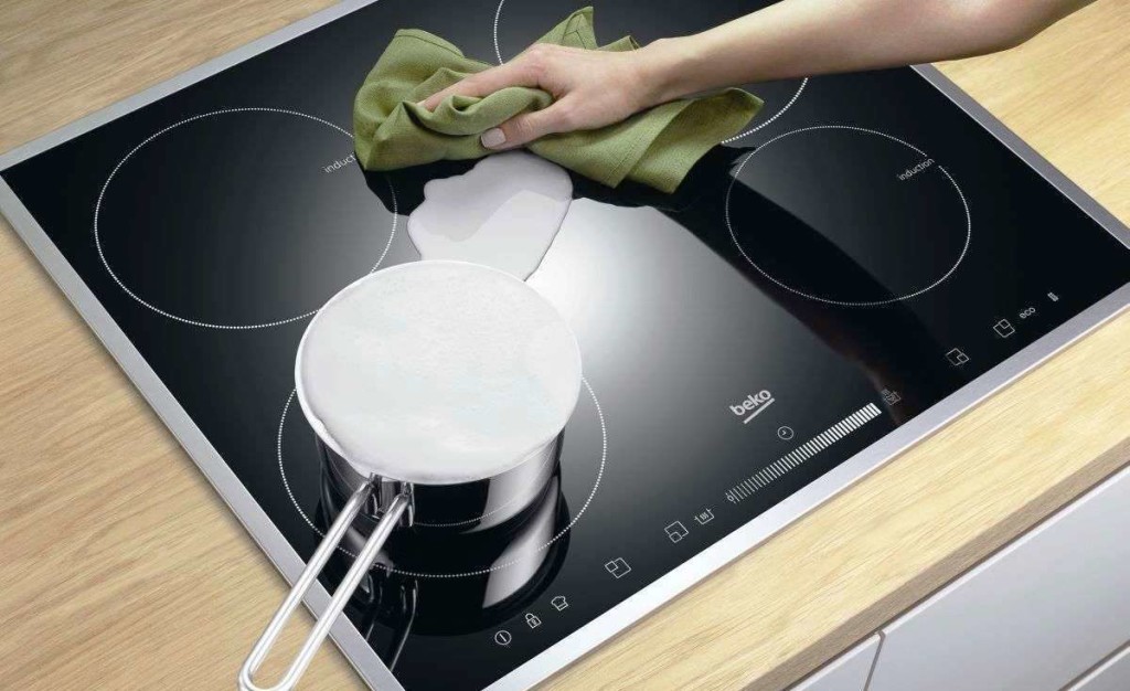 Гладкая поверхность из стеклокерамики легко очищается от брызг жира, воды, частиц пищи. Достаточно несколько раз провести по панели влажной губкой, чтобы довести ее до зеркального блеска. Но следует учесть, что для очистки стеклокерамики нельзя применять абразивные средства, а лишь жидкие моющие составы. Стеклокерамика вступает в реакцию с сахаром. Поэтому пролившиеся сахарсодержащие жидкости (сироп, компот. молоко) нужно немедленно вытереть с поверхности. Иначе на панели могут возникнуть трудноудаляемые пятна.