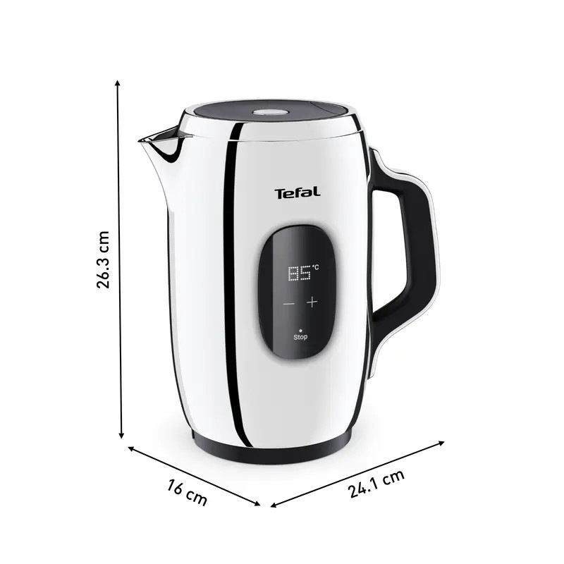 Електрочайник Tefal Majestuo об'ємом 1,5 л поєднує стильний дизайн та сучасні технології. Він оснащений подвійними стінками для безпечності та підтримання тепла, сенсорним управлінням і дев'ятьма температурними режимами для різних напоїв. Функція підтримання температури дозволяє довше зберігати тепло, а міцний корпус із нержавіючої сталі гарантує довговічність.