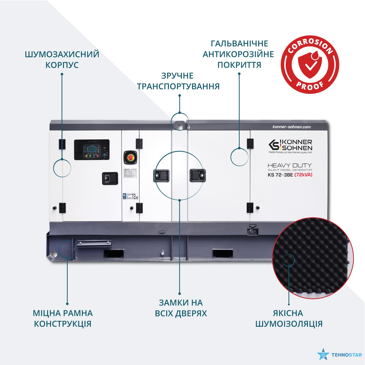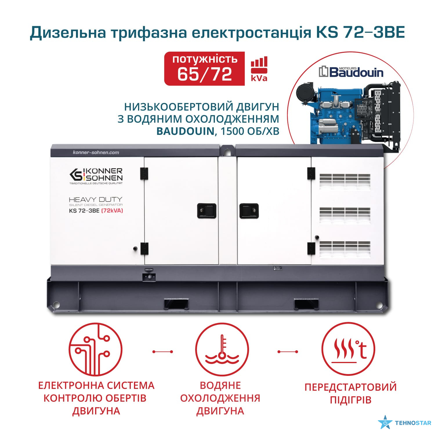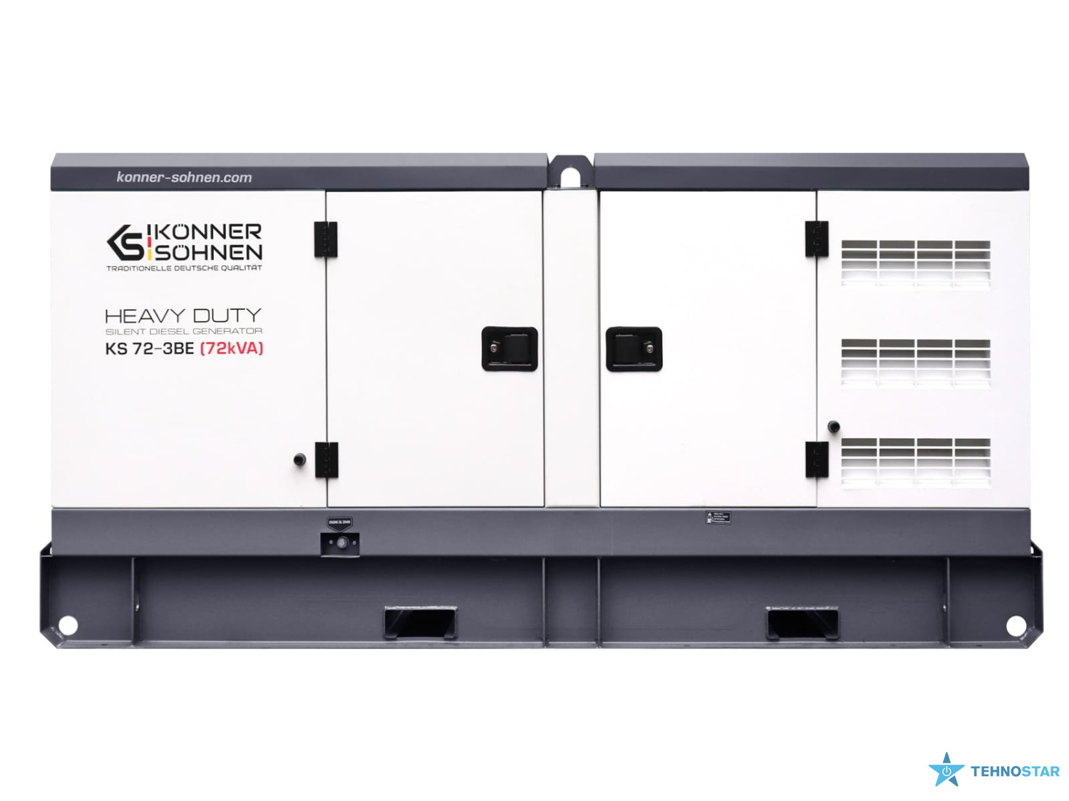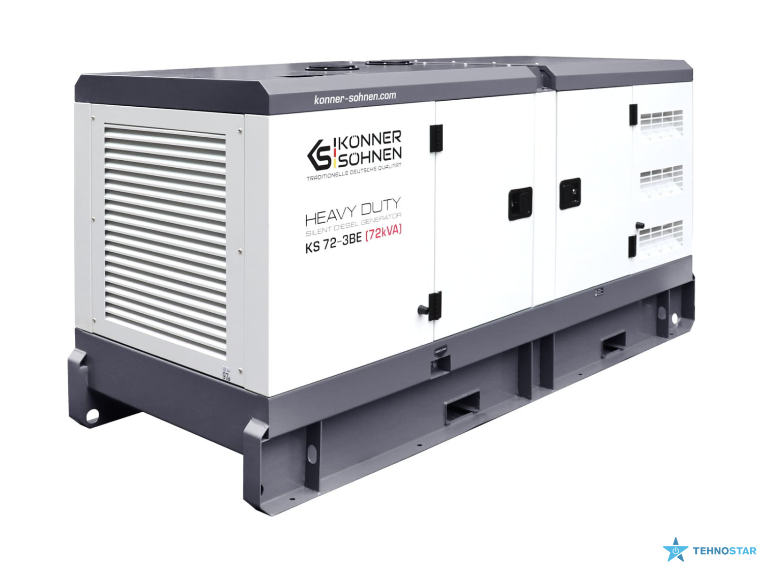 Konner&Sohnen KS 72-3BE — трифазний дизельний генератор, створений для стабільного живлення об’єктів із високим енергоспоживанням. Він працює на базі двигуна Baudouin з рідинним охолодженням та оснащений синхронним альтернатором Stamford type із самозбудженням, що забезпечує чисту напругу без перепадів. Шумозахисний всепогодний корпус із гальванічним покриттям захищає від корозії та механічних пошкоджень, дозволяючи експлуатацію на відкритому повітрі.
