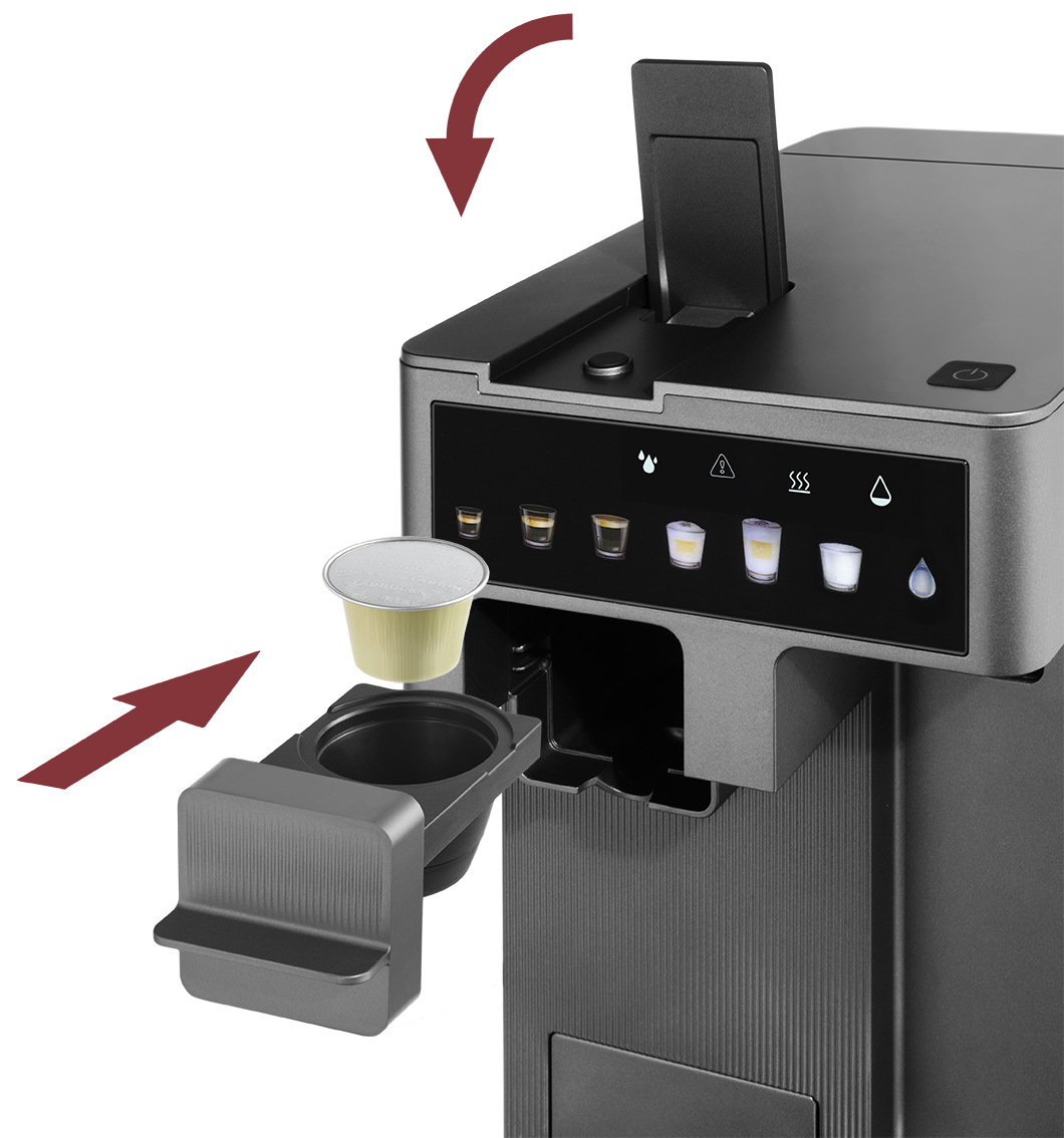 Гнучкість забезпечують три змінні адаптери під найпоширеніші капсульні формати і окремий адаптер для меленої кави — можна обрати зручний спосіб приготування. Для напоїв на основі молока в комплекті є молочний контейнер і спінювач: молоко подається з окремої ємності, підігрівається та збивається до заданої консистенції.