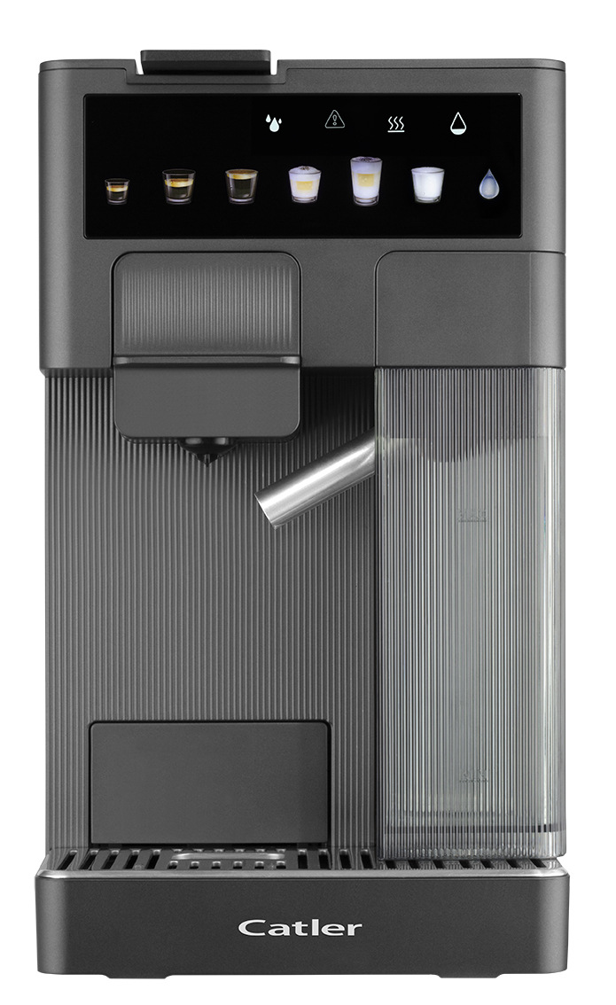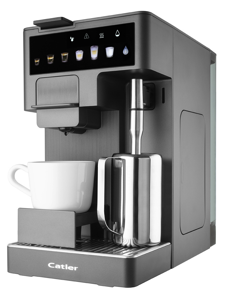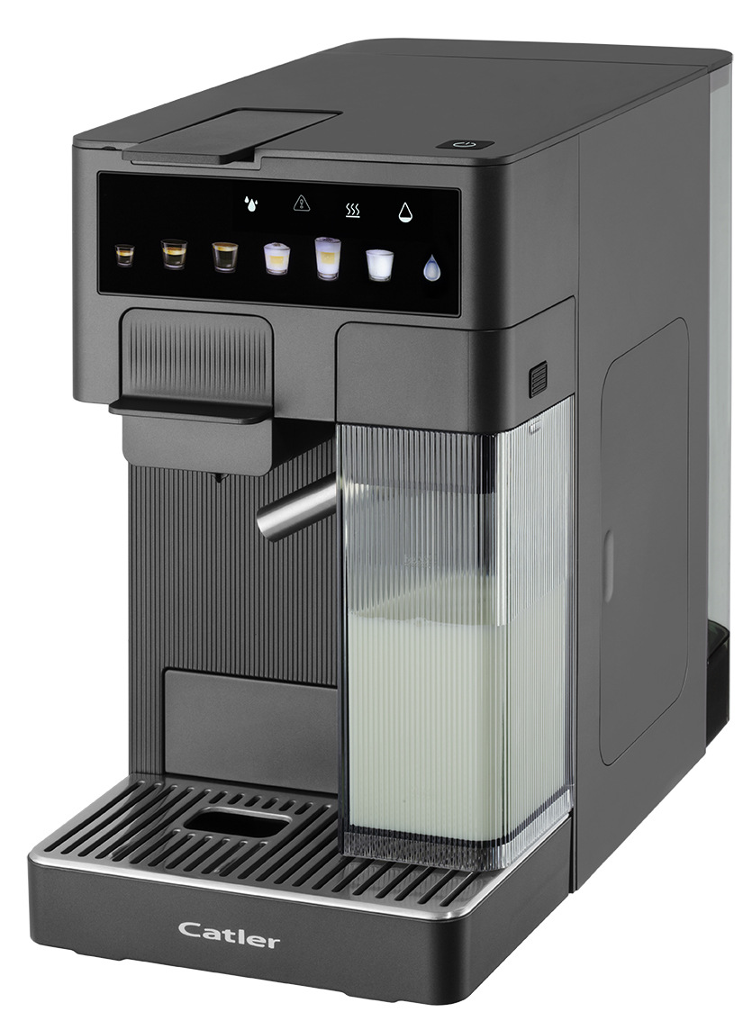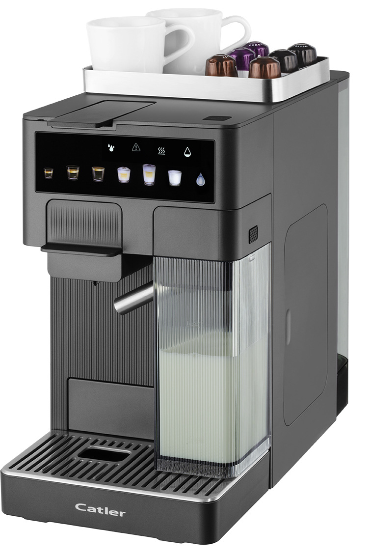 Catler ES 750 G Renzo — автоматична еспресо-кавомашина з підтримкою капсул і меленої кави. Тиск помпи 20 бар, знімний бак для води 1,6 л, кольоровий сенсорний дисплей і три розміри чашки для швидкого вибору подачі. У комплекті 3 адаптери під найпоширеніші капсульні формати та адаптер для меленої кави, передбачено контейнер для молока та спінювач.