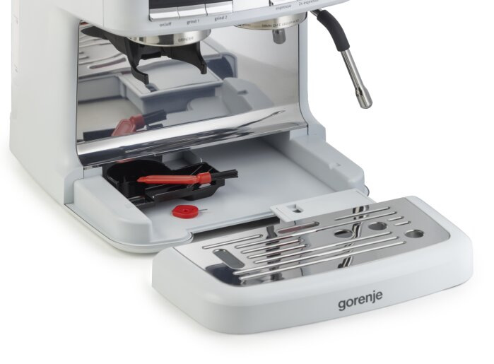 Кавоварка Gorenje GSACM20W — ріжкова модель з вбудованою кавомолкою для кавових зерен, що дозволяє готувати еспресо, капучино та інші напої. Об’єм резервуара води 2,5 л і контейнера для зерен 0,25 л забезпечують комфортне використання без частого дозаповнення. Тиск 20 бар гарантує насичений смак, капучинатор швидко готує молочну пінку. Кнопочне керування, можливість приготування 2 чашок одночасно, автоматичне регулювання дозування кави. Білий пластиковий корпус, компактні розміри 31,6 × 41 × 35 см.