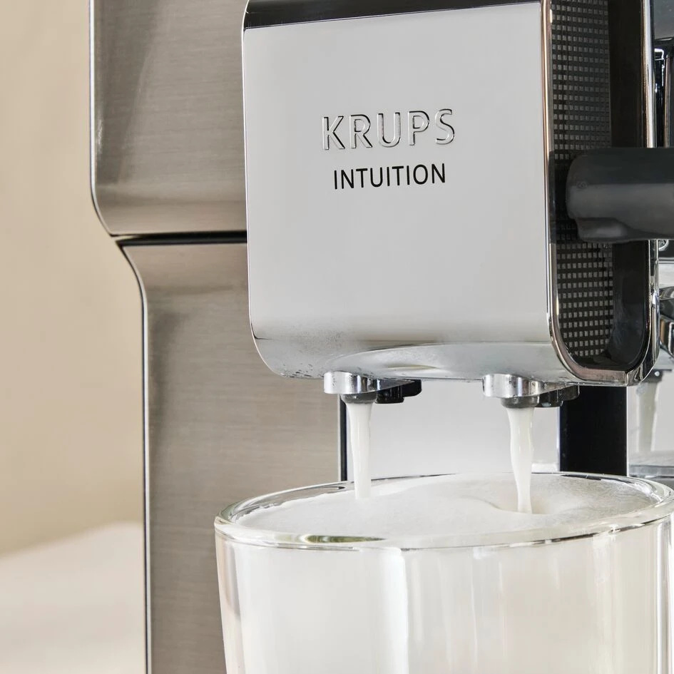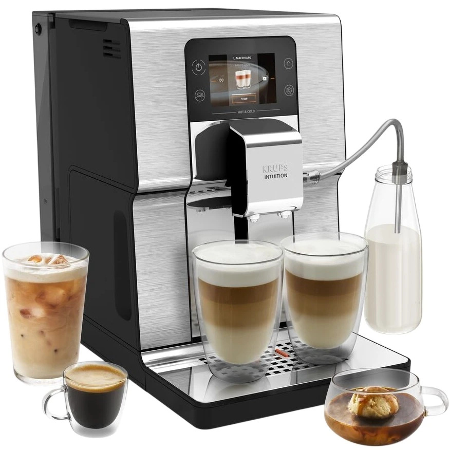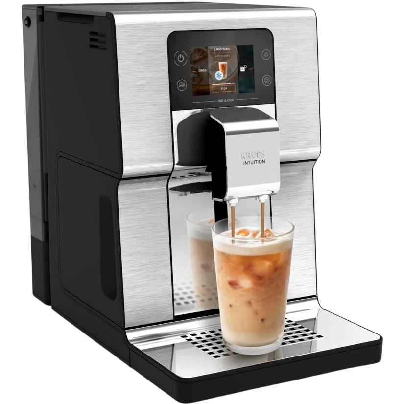 Krups Intuition Experience Hot&Cold EA879E — це флагманська повністю автоматична кавомашина 2024–2025 років, яка поєднує преміальний дизайн, інноваційні технології гарячих і холодних напоїв та максимальну зручність використання. Потужність 1550 Вт і тиск 15 бар у поєднанні з конічною металевою кавомолкою (5 ступенів помелу) та регульованим заварювальним блоком (6–9 г кави) гарантують професійну якість еспресо, лунго, американо, капучино та авторських холодних напоїв. Унікальна особливість — повноцінне приготування холодних кавових напоїв (фраппе, айс-лате, нітро-кава, охолоджений капучино) без додаткового льоду завдяки спеціальній технології охолодження та подачі. Сенсорний дисплей Smart Slide з інтуїтивним свайп-управлінням, 36 автоматичних рецептів, 8 персональних профілів, 3 рівні температури та 4 ступені міцності дозволяють налаштувати каву індивідуально для кожного користувача. Автоматичний капучинатор з функцією одночасного приготування двох молочних напоїв, самоочищення молочної системи та великий резервуар для води 3 л роблять щоденне використання максимально комфортним. Кавомашина одна з найтихіших у своєму класі, має автоматичне визначення накипу, програми очищення та 19 мов інтерфейсу. Стильний сріблястий корпус, знімний зливний піддон, велика висота подачі (14 см) під високі склянки та комплект для старту (фільтр для води, таблетки для чищення, порошок від накипу) доповнюють преміальний рівень моделі. Вироблена у Франції, офіційна гарантія 24 місяці.