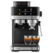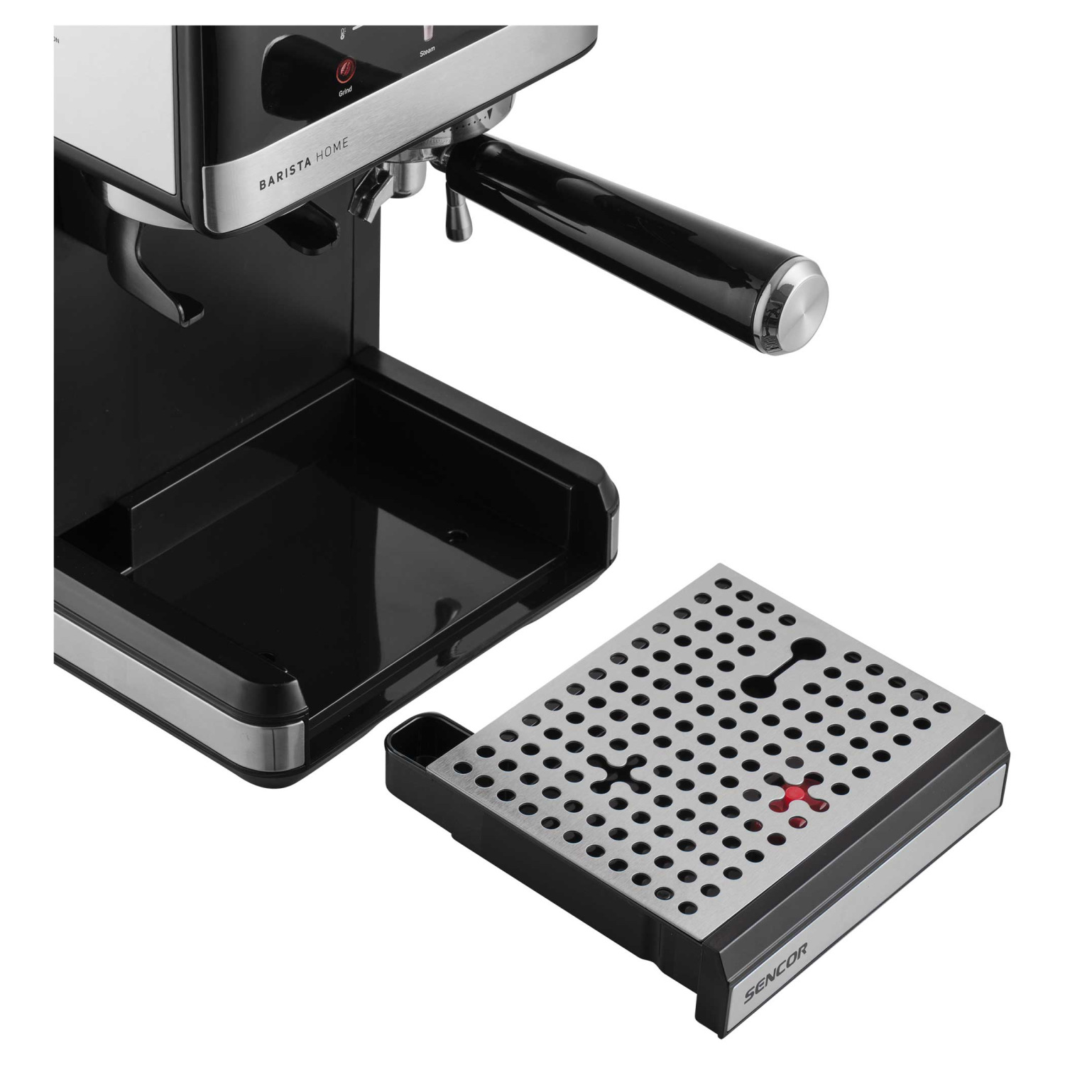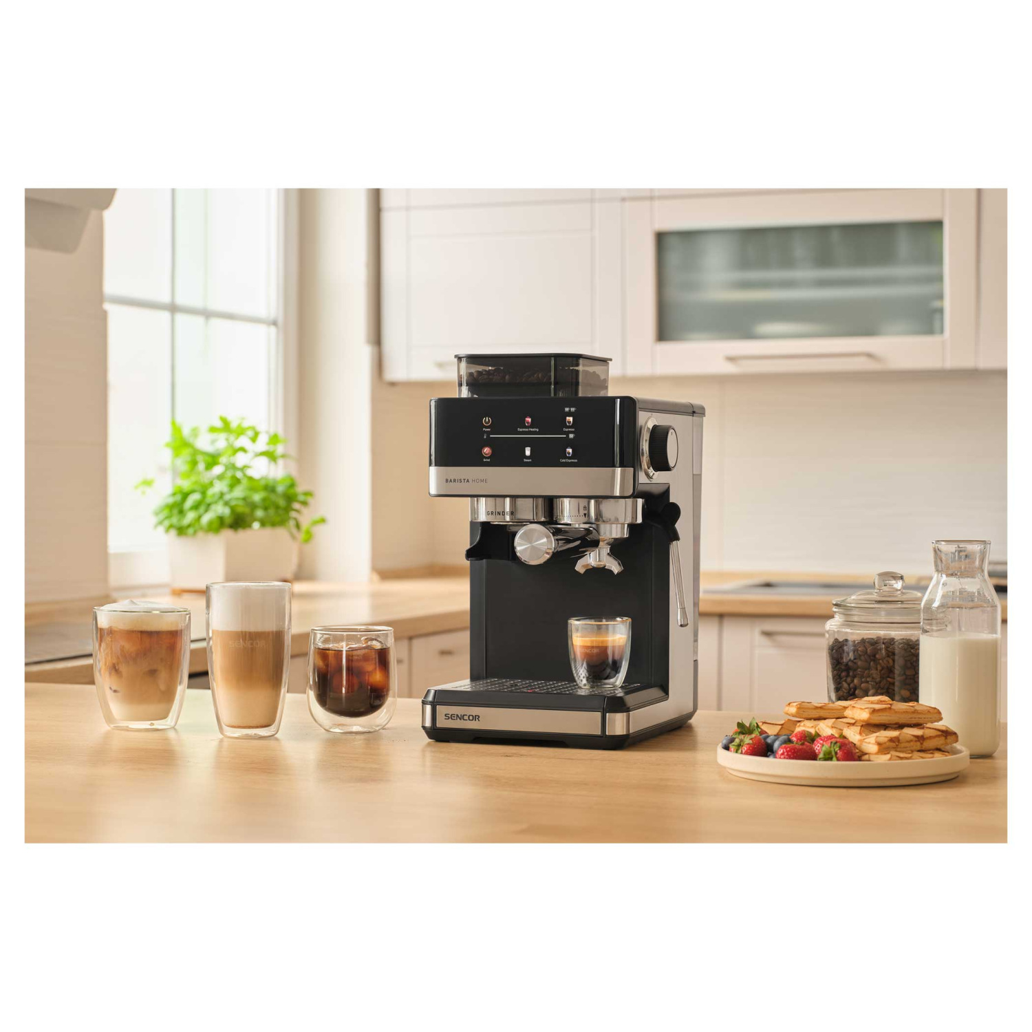 Кавоварка Sencor об’єднує функції еспресо-машини та кавомолки, забезпечуючи приготування кави зі свіжомелених зерен. Вбудована металева кавомолка має 20 ступенів помелу — від дрібного до грубого. Італійський насос із тиском 20 бар створює стабільну екстракцію, а система Thermoblock гарантує швидкий нагрів. Сенсорний кольоровий дисплей з піктограмами робить керування зручним і наочним. Поворотна парова насадка дає змогу спінювати молоко, а функція попереднього заварювання підсилює аромат. Модель обладнана знімним піддоном для крапель, підігрівачем чашок та функцією автоматичного вимкнення.