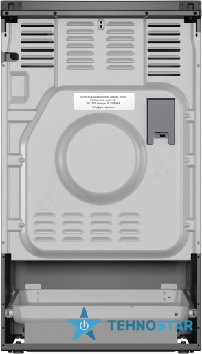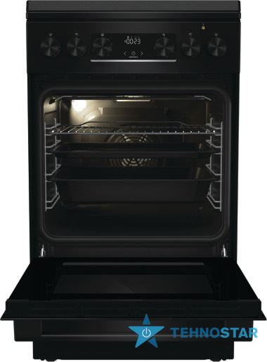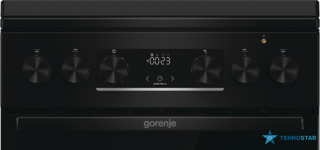 Дизайн плити витриманий у чорному кольорі з подвійним склом дверцят і корпусом із нержавіючої сталі, що додає сучасності та довговічності. Механічний таймер і контроль температури (термостат) допомагають точно керувати процесом приготування страв.