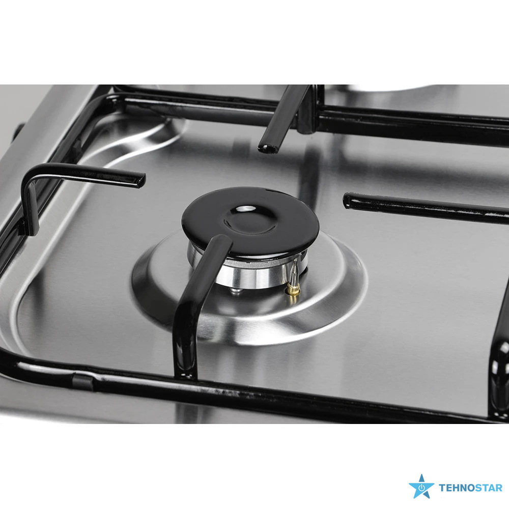 Варильна поверхня має чотири конфорки з газовим контролем — це означає, що подача газу перекривається, якщо полум’я загасне. Решітки на конфорках виконані з емальованої сталі, що легше очищується, ніж чавун, але при цьому забезпечує надійну підтримку посуду.