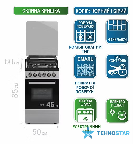 Prime Technics PSGE 50223 B — це комбінована плита, яка поєднує газові та електричні зони нагріву, пропонуючи гнучкість у виборі способу приготування страв.