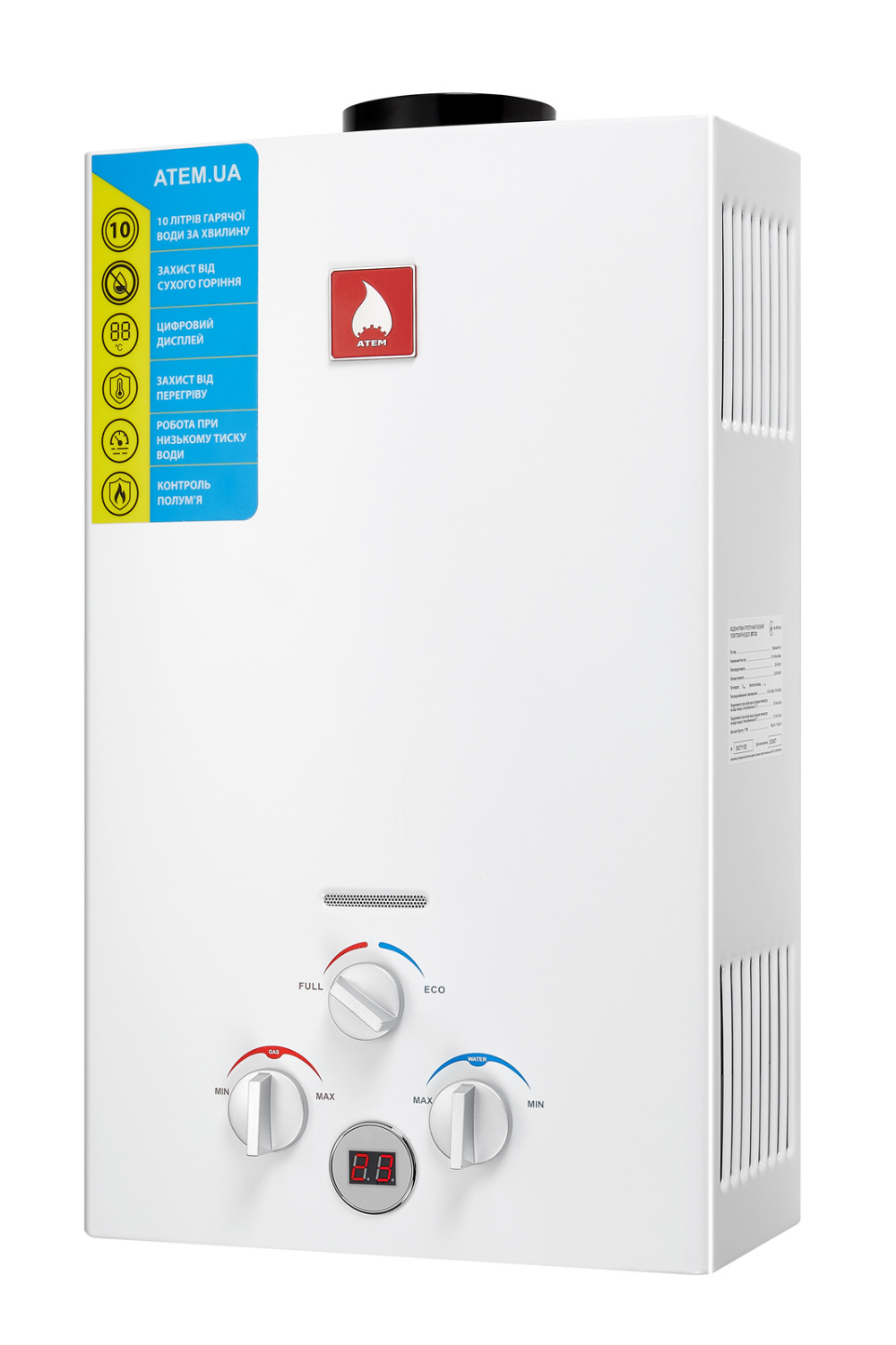 Безпека в Atem ВПГ-20М є пріоритетом, тому пристрій оснащено комплексною Системою контролю тяги та захистом від перегріву, що автоматично блокує подачу газу при будь-яких відхиленнях від норми. Модель спеціально адаптована до особливостей українських мереж, тому вона демонструє стабільну роботу навіть при критично низькому тиску води чи газу. Це надійний технічний супутник, який перетворює процес отримання гарячої води на просту і зрозумілу дію, звільняючи ваш час для дійсно важливих речей.