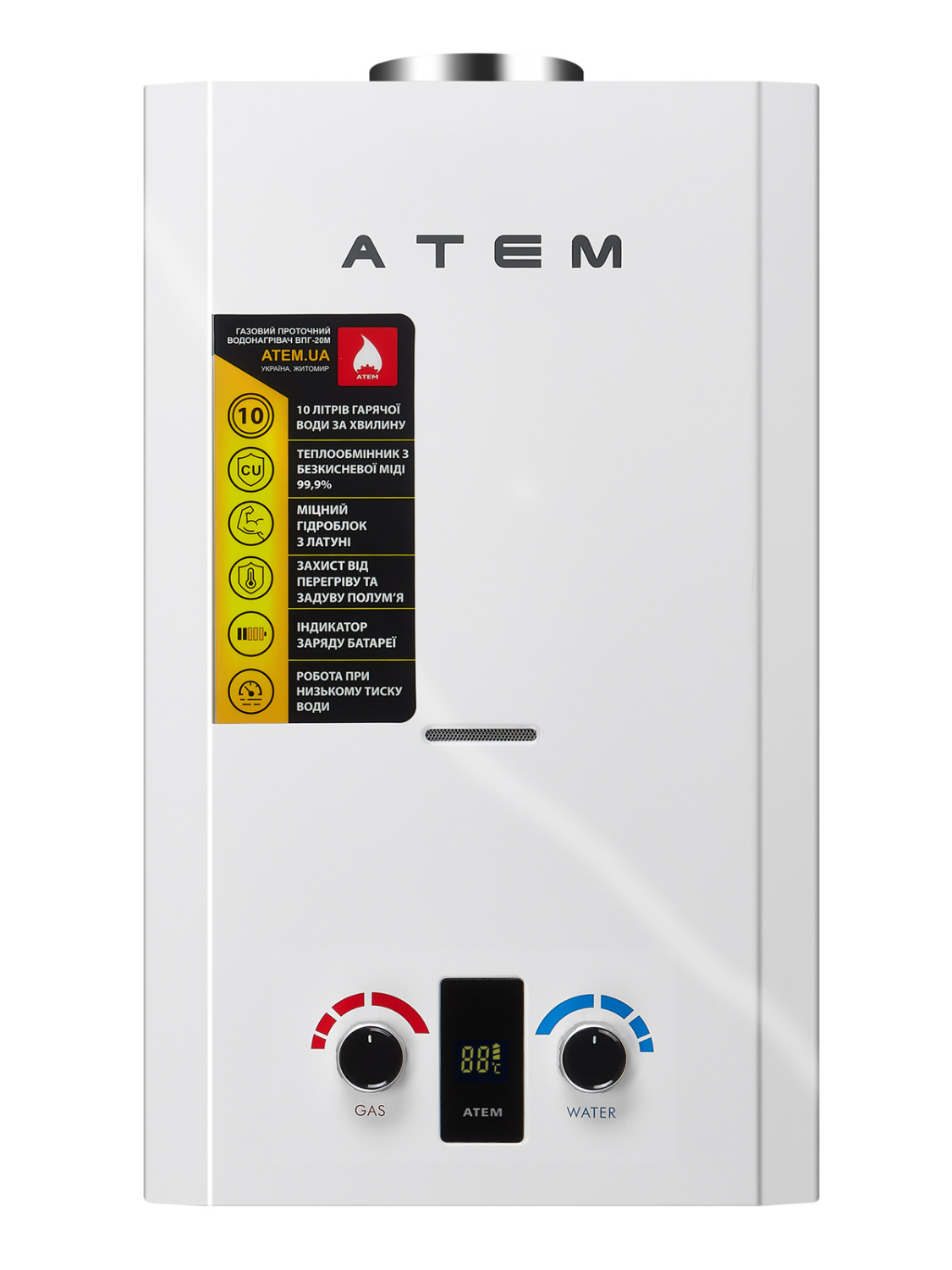 Газова колонка Atem ВПГ-20М стає еталоном домашнього комфорту, пропонуючи абсолютну автономність від примх електромережі без жодних компромісів у зручності. Цей димохідний водонагрівач розроблений для тих, хто прагне отримати безперебійний доступ до гарячої води, зберігаючи при цьому естетику простору завдяки лаконічному дизайну. Ключова перевага пристрою полягає у його здатності працювати від звичайних батарейок, що забезпечує миттєвий автоматичний запуск: ви просто відкриваєте кран, а розумна автоматика бере на себе всю роботу. Інформативний LED-дисплей на передній панелі повертає повний контроль над процесом, дозволяючи візуально відстежувати комфортну температуру без необхідності налаштовувати воду «на дотик».