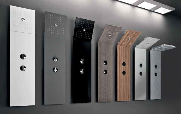 - Материалы. В каталоге представлены модели, изготовленные из алюминиевого сплава, латуни, нержавеющей стали и стекла. Панели из алюминия привлекают стильным дизайном и доступной ценой. В этой модельной линейке можно подобрать и купить гидромассажную панель в цвете матовый или сатинированный хром или в черном цвете. Изделия из нержавеющей стали или латуни стоят несколько дороже алюминиевых аналогов. Но они обладают более высоким рабочим ресурсом, хорошо противостоят перепадам давления воды в системе, любым механическим воздействиям. Панели со стеклянными корпусами впечатляют стильным необычным дизайном. Такие модели хорошо смотрятся в современных интерьерах в стиле хай-тек или минимализм.