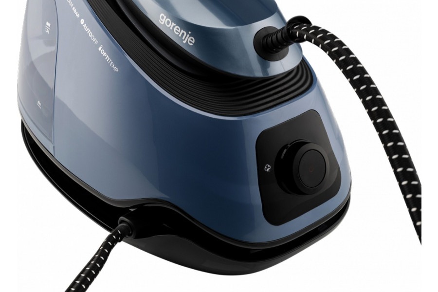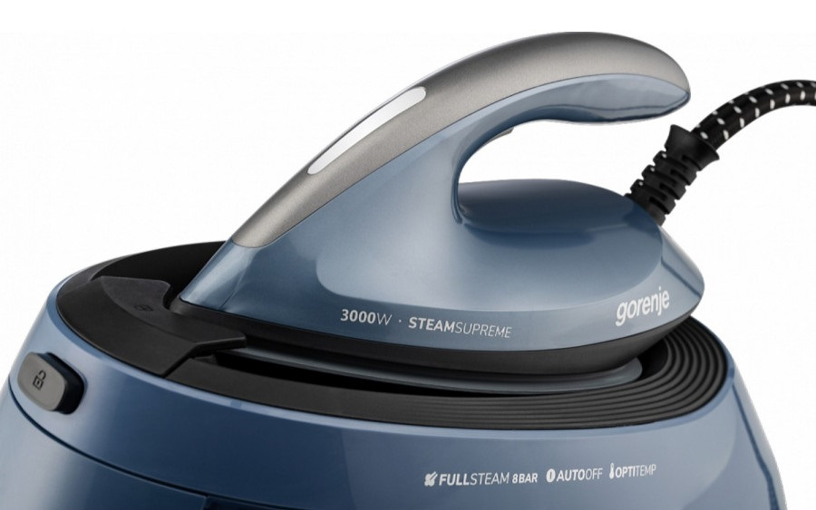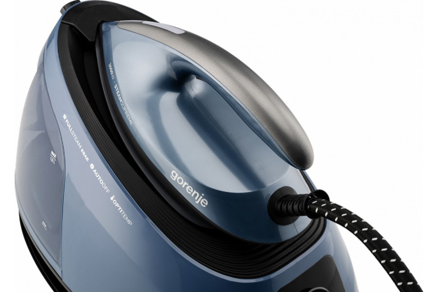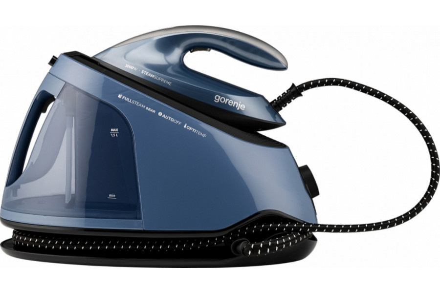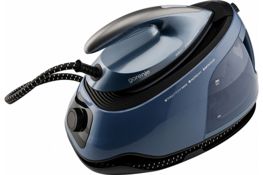 Праска-парогенератор Gorenje потужністю 3000 Вт оснащена резервуаром на 1,5 л, системою подачі пари 160 г/хв та паровим ударом 480 г/хв. Має LED-дисплей, знімний бак, систему проти накипу, автоматичне вимкнення та керамічну підошву. Тиск пари – 8 бар.