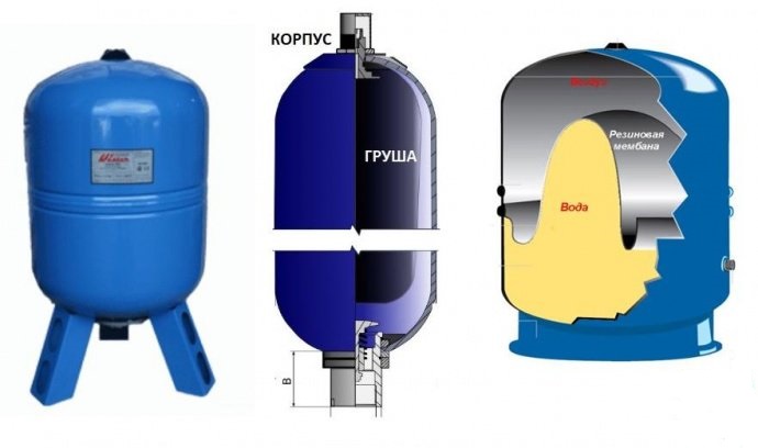 Конструктивно бак складається з металевого корпусу та гумової мембрани всередині. Частина об’єму заповнена повітрям під тиском, інша — водою. При подачі води насосом, вона стискає повітря в баку, створюючи необхідний тиск. Коли насос вимикається, вода з бака подається до споживача.