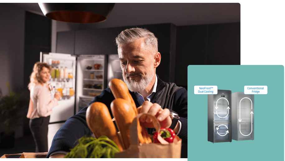 Дуже важко уникнути змішування запахів їжі, коли ви зберігаєте рибу в морозильній камері й торт із кремом у холодильній. Дві окремі системи з технологією двоконтурного охолодження NeoFrost™ для кожного відділення забезпечують ідеальний потік повітря й оптимальну температуру в морозильній камері та в холодильнику. Завдяки цьому їжа залишається свіжою довше, не обмерзає та не вбирає сторонні запахи.