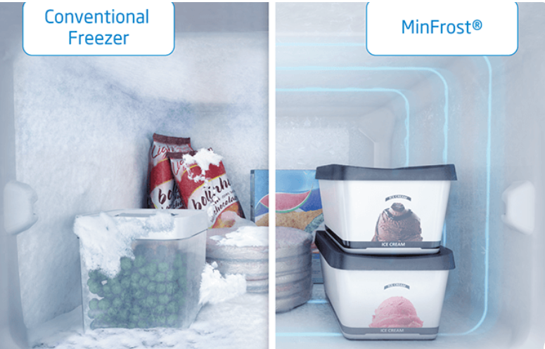 Через намерзання льоду продукти в холодильнику злипаються, а пристрій споживає більше електроенергії. Спеціальна система випаровування MinFrost® мінімізує обмерзання всередині холодильника. Це означає, що заморожені продукти зберігатимуться довше, споживатиметься менше електроенергії, а розморожувати холодильник знадобиться рідше.