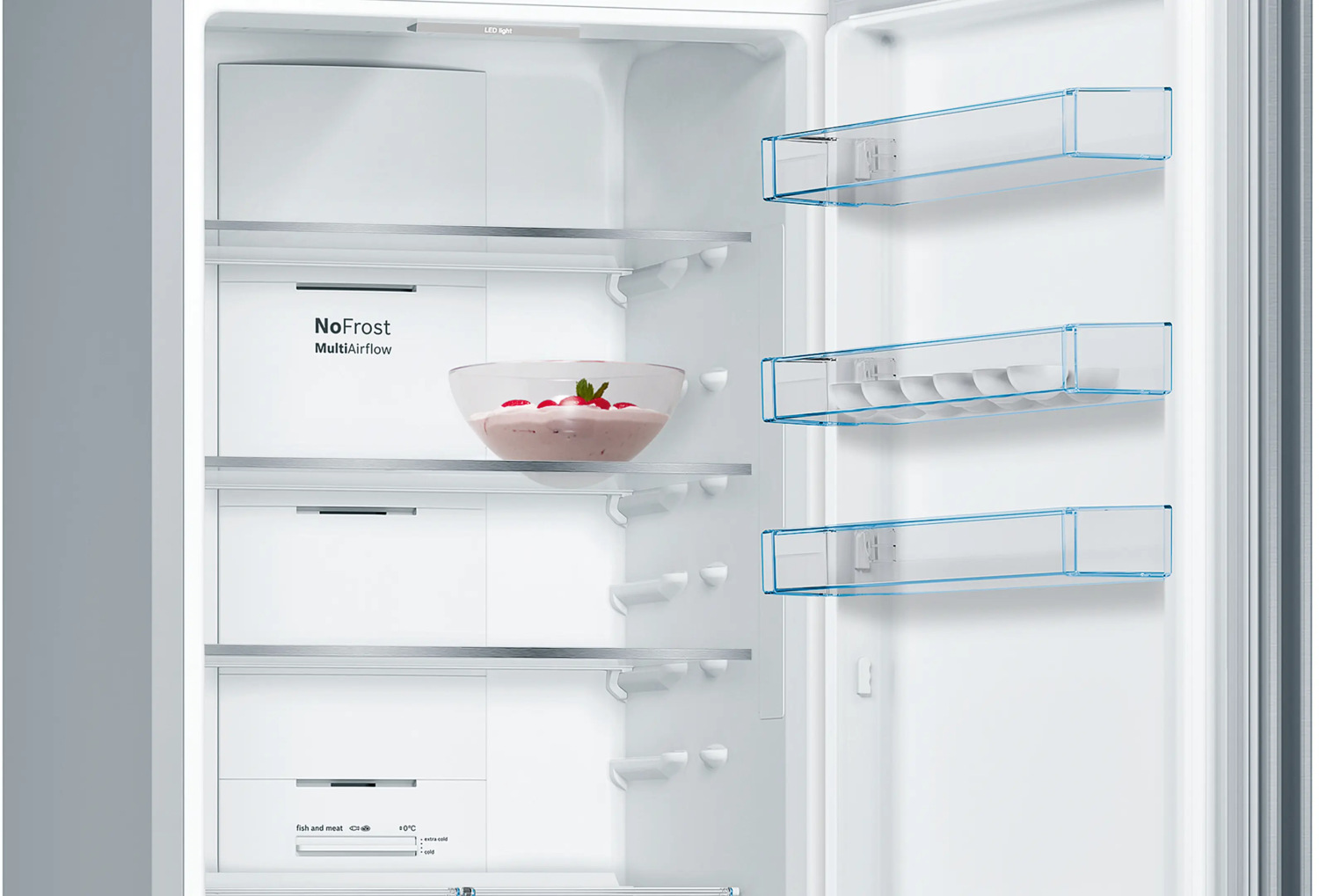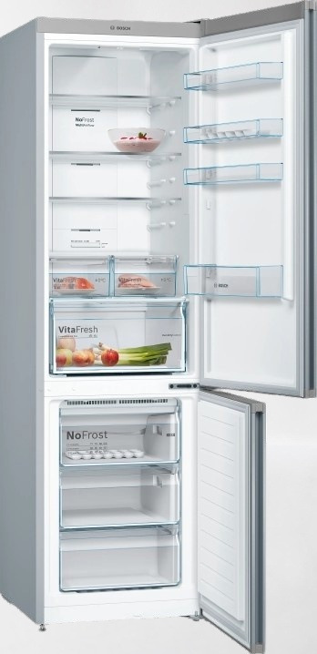 Холодильник з нижньою морозильною камерою, оснащений технологіями NoFrost та VitaFresh, зберігає продукти свіжішими довше.
