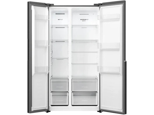 Двокамерний холодильник Side-by-Side Gorenje NRS917E41BX – сучасне та високотехнологічне рішення для великих родин, що поєднує вражаючу місткість, енергоефективність класу A+ та елегантний дизайн у чорному кольорі з коламінованої сталі. Конфігурація Side-by-Side з двома широкими дверцятами (холодильна камера відкривається праворуч, морозильна – ліворуч) забезпечує зручний доступ до всіх продуктів та мінімізує втрати холоду під час відкривання. Вражаючий загальний корисний об'єм 531 літр (брутто 570 л) ділиться на просторі 345 літрів холодільної камери та 186 літрів морозільної камери, що робить цю модель оптимальним вибором для сімей з 4-6 осіб або тих, хто веде активний спосіб життя та потребує зберігати великі запаси продуктів. Компактні для класу Side-by-Side габарити 178.6 см висотою, 91.1 см шириною та 61.5 см глибиною дозволяють встановити холодильник навіть у стандартних кухнях, де цінується кожен сантиметр простору.