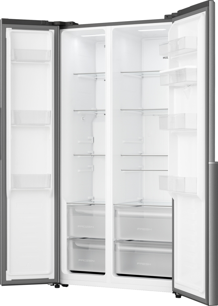 Формат side-by-side з окремими дверцятами для холодильного та морозильного відділень створює зручну систему зберігання. Загальний об’єм 541 л дозволяє розподілити продукти за категоріями. П’ять скляних полиць, дверні модулі та два контейнери для овочів і фруктів формують структурований внутрішній простір.