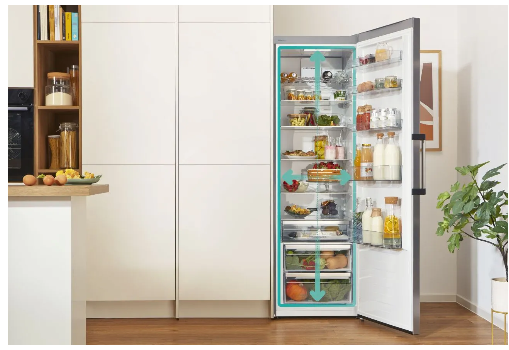 Інтелектуальна система AdaptTech аналізує режим користування та підтримує стабільну температуру незалежно від частоти відкривання дверцят. Це допомагає зменшити різкі перепади температури та зберігати якість продуктів протягом довшого часу. Система вентиляції DynamicAir рівномірно розподіляє охолоджене повітря по всьому об’єму холодильника, забезпечуючи однакові умови на кожному рівні.