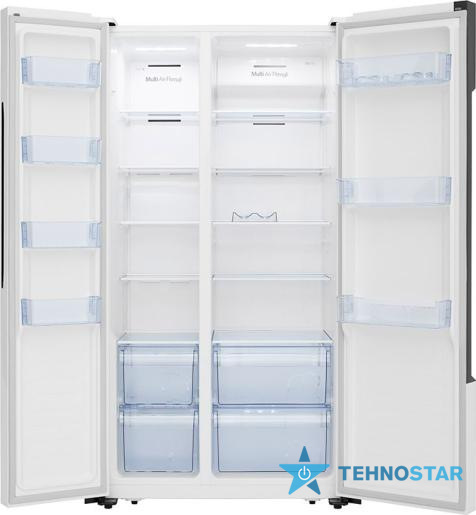Hisense RS 670N4HW1 оснащений системою Multi Air Flow, яка рівномірно розподіляє холодне повітря по всіх відділеннях, завдяки чому продукти довше залишаються свіжими. Система Total No Frost виключає утворення льоду та інею, зменшуючи потребу в догляді за приладом. Двохконтурне охолодження забезпечує незалежну роботу холодильного та морозильного відділень.