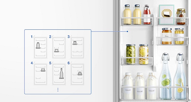 В дверце холодильника имеется четыре контейнера, которые можно переставлять по своему усмотрению и таким образом с легкостью разместить предметы любых размеров. Контейнеры можно расставить таким образом, чтобы в них поместились бутылки или упаковки любых размеров. Это позволяет обеспечить максимально эффективное использование пространства.