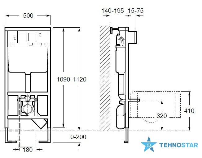 Інсталяція для чаші підвісного унітазу. З бачком, механізмом подвійного зливу на 3/6 літра та комплектом кріплення