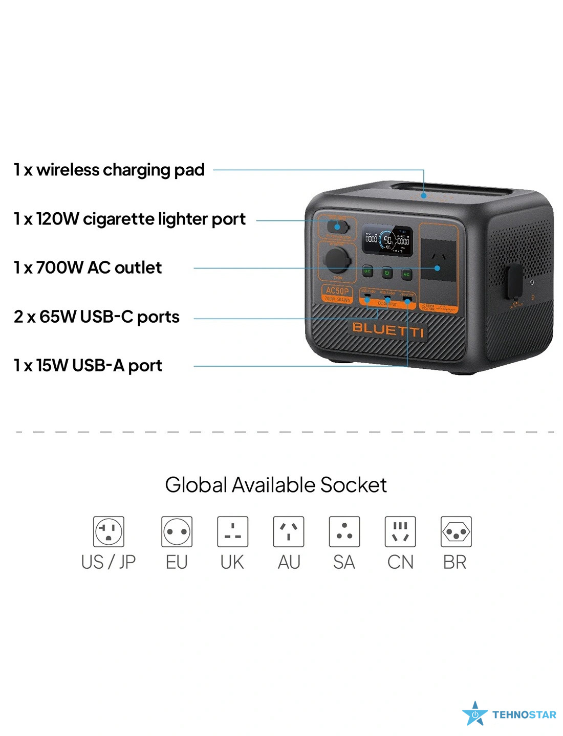 Bluetti AC50P має кілька вихідних портів — AC-розетку, USB-C, USB-A та автомобільний порт — завдяки чому можна одночасно підключати кілька гаджетів без додаткових адаптерів.