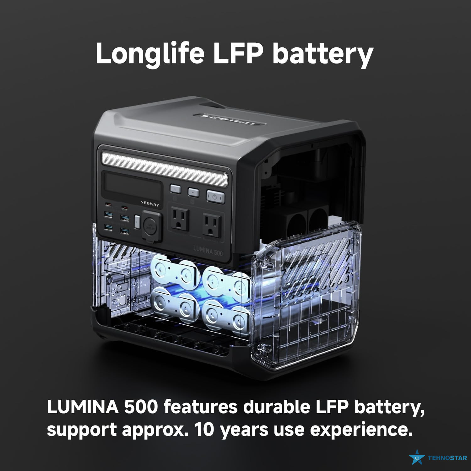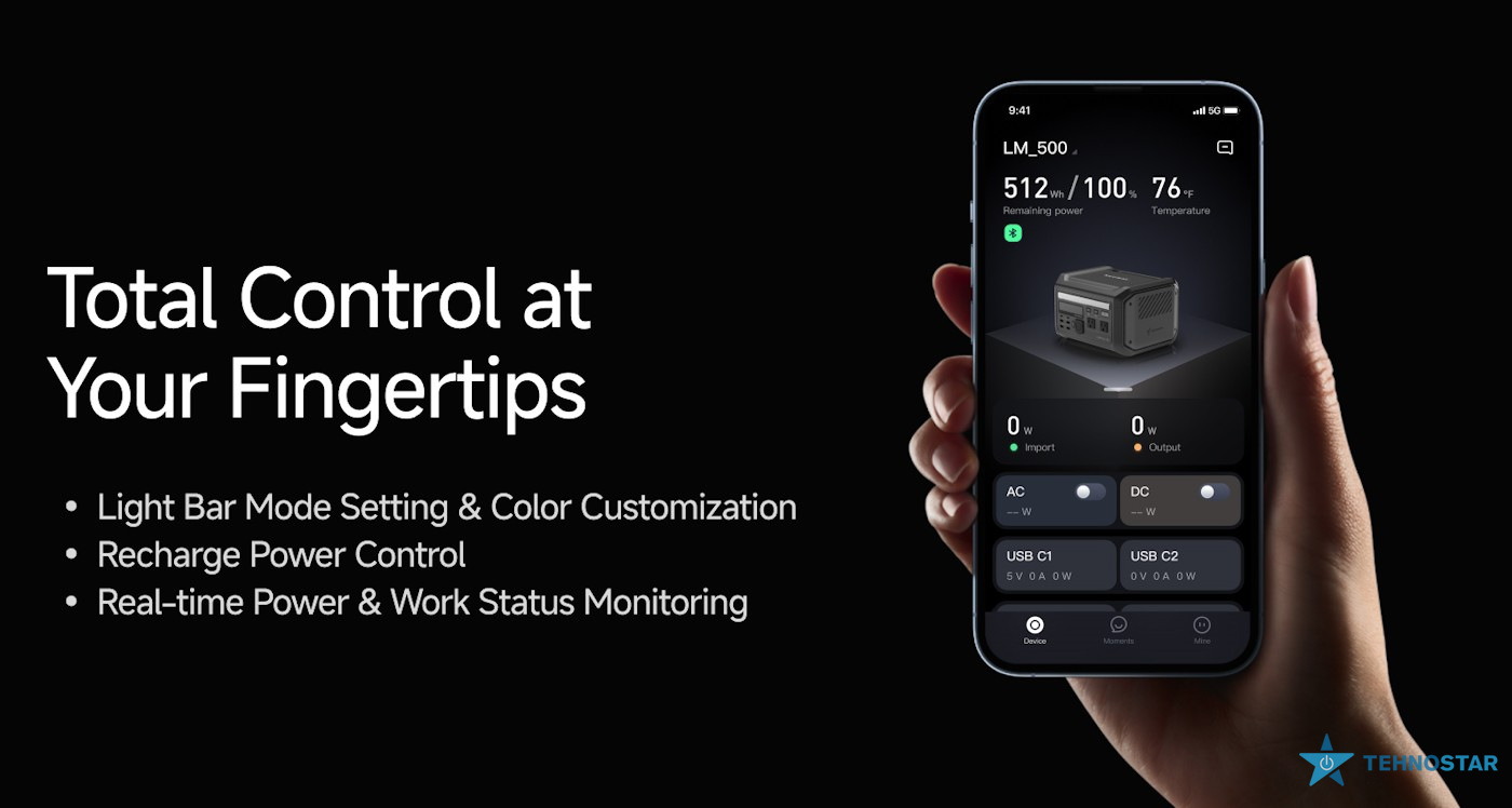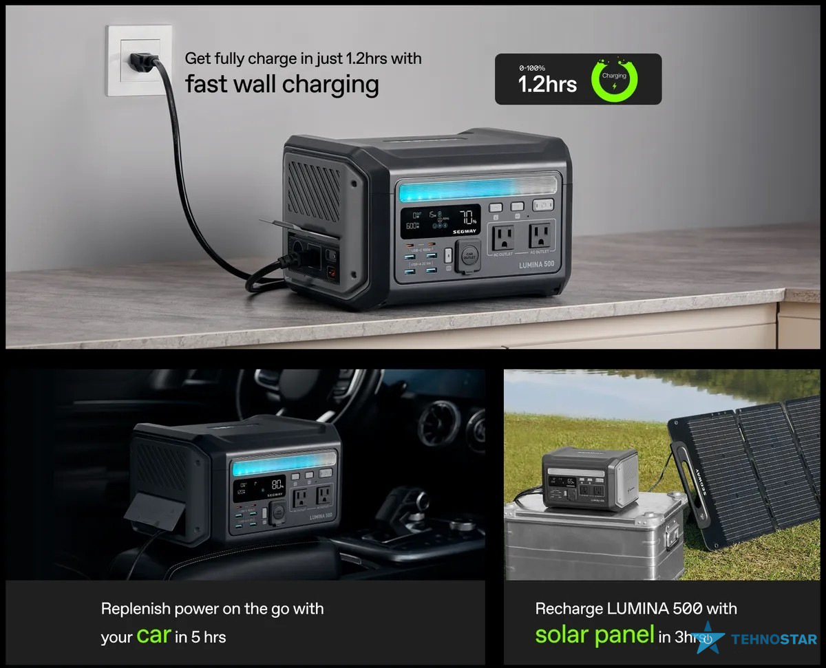 Завдяки дев'яти вихідним портам, включаючи два роз'єми змінного струму, два USB Type-C (100 Вт), чотири USB Type-A та автомобільну розетку, Lumina 500 забезпечує універсальність у підключенні різноманітних пристроїв. Вбудована система швидкої зарядки дозволяє швидко поповнювати енергію станції, а інтерактивне підсвічування додає естетичний вигляд та може служити додатковим джерелом освітлення.