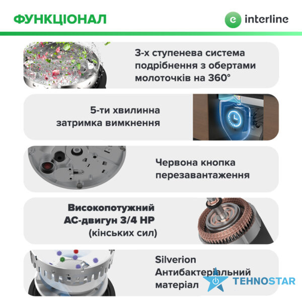 Двигун забезпечує швидке та якісне подрібнення навіть твердих відходів — кісток птиці, фруктових шкірок чи овочевих залишків.