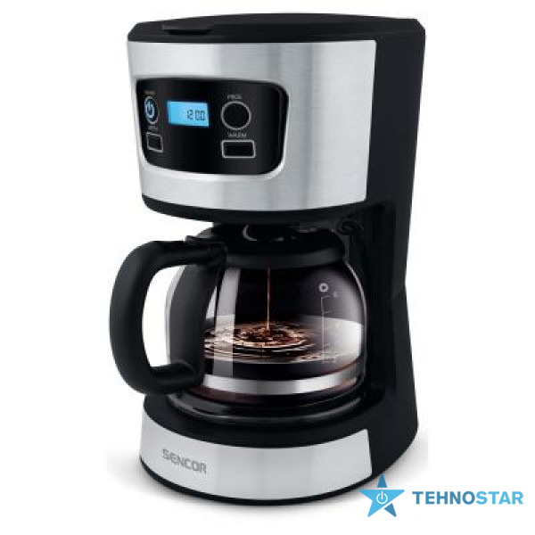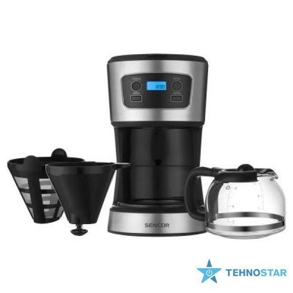 Пристрій поєднує скляну колбу та корпус із міцного пластику з елементами нержавіючої сталі. Чорне забарвлення приховує подряпини та сліди експлуатації, зберігаючи приємний зовнішній вигляд. Передня панель оснащена електронним дисплеєм і кнопками керування, що надає кавоварці сучасного вигляду та полегшує інтуїтивне управління.