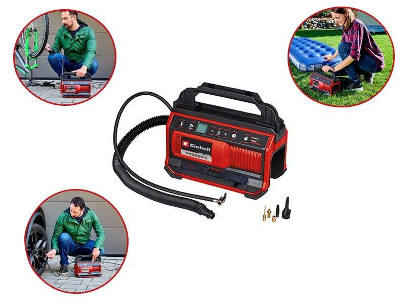Einhell 4020430 — це універсальний та потужний компресор, головною перевагою якого є гібридна система живлення. Пристрій може працювати як від звичайної побутової розетки (220 В), так і повністю автономно від 18-вольтового акумулятора єдиної лінійки Power X-Change. Це робить його незамінним помічником, який однаково зручно використовувати в гаражі, вдома або в подорожах далеко за містом. (Зверніть увагу: акумулятор та зарядний пристрій не входять до комплектації).