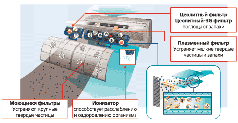 Некоторые модели кондиционеров оснащены системой плазменной очистки, которая является уникальной разработкой компании Toshiba. Основа этой системы – пластинчатый фильтр со специальным покрытием, содержащим ионы серебра. Фильтр обеззараживает воздух, очищает его от неприятных запахов и посторонних примесей.