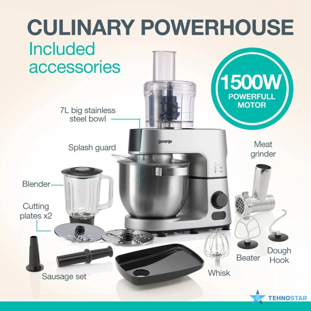 Кухонний комбайн Gorenje MMC1500SCX — це потужний та універсальний прилад, який стане справжнім помічником в будь-якій кухні. Його дизайн поєднує міцні матеріали з елегантними формами, а функціональність дозволяє замінити одразу кілька пристроїв: він може обробляти продукти, готувати тісто, змішувати, подрібнювати, використовувати блендер тощо. Завдяки широкому набору насадок (м’ясорубка, блендер, вінчик, крюк для тіста, терка/шинковка та інші), ви зможете реалізувати багато кулінарних завдань без необхідності купувати окремі пристрої.