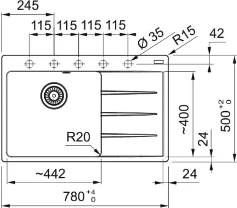 Отвори під змішувач та дозатор для рідкого мила попередньо підфрезеровані. Збільшена кількість можливих отворів дає можливість встановити на мийку додаткові аксесуари, такі як дозатор мийних засобів, краник під фільтровану воду, кнопку вмикання подрібнювача харчових відходів тощо.