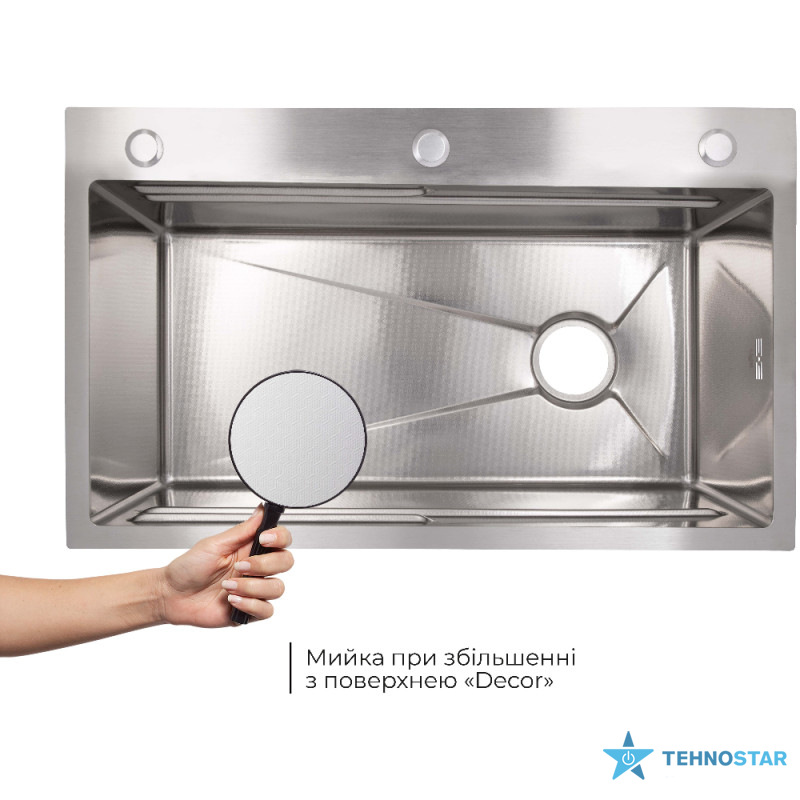 Інтегрована мийка Lidz Handmade з поверхнею Decor Honeycomb. Збільшена товщина сталі 3,0/1,0 мм робить модель максимально міцною, а фактурна поверхня виділяє її в інтер’єрі. Простора чаша зручна для миття великого посуду.