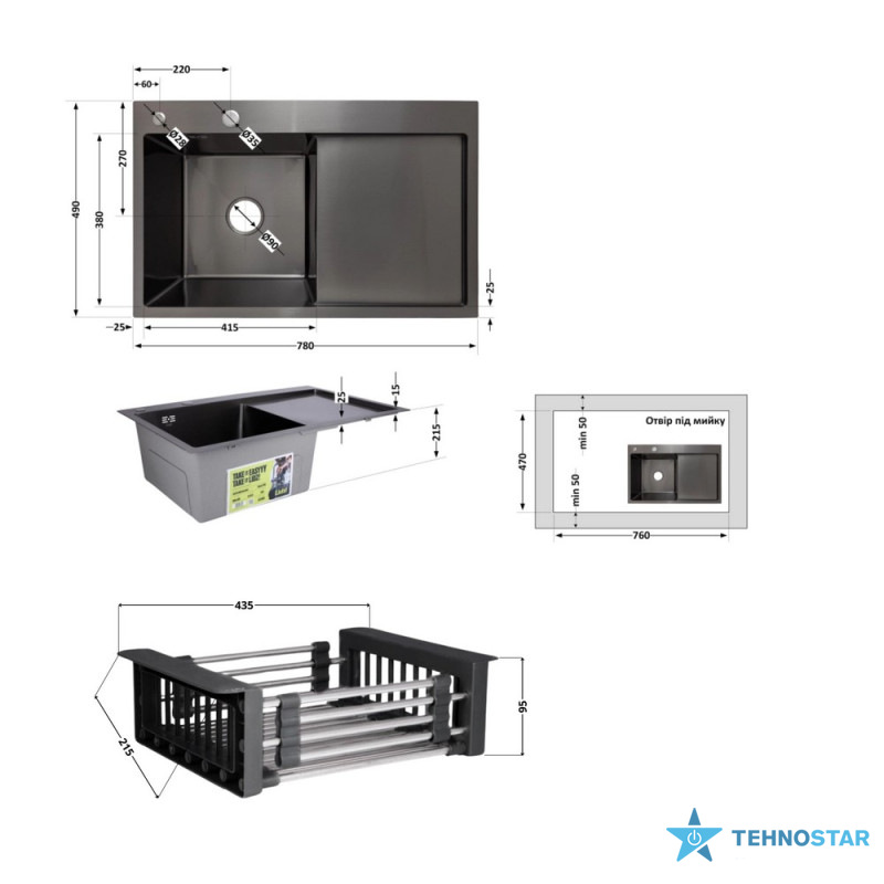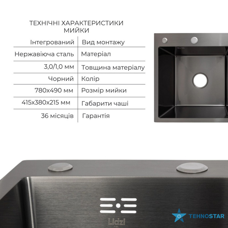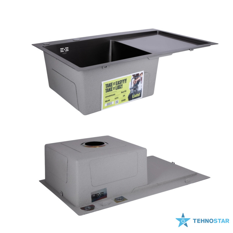 Комплект Lidz Handmade H7849BR (BlackPVD) пропонує простору чорну мийку з правим крилом, дозатор і кошик Lidz K01B, забезпечуючи зручність і красу.